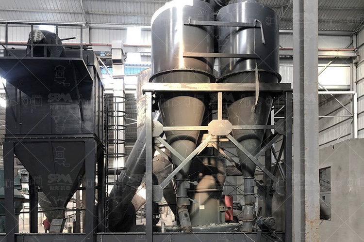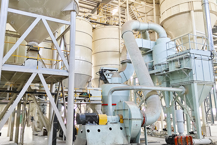 原料經(jīng)變頻皮帶給料機(jī)均勻定量連續(xù)地送入主機(jī)磨室內(nèi)進(jìn)行研磨。粉磨后的物料被風(fēng)機(jī)氣流送入選粉機(jī)進(jìn)行分級(jí),在分析機(jī)的作用下,不符合細(xì)度要求的物料落入磨室內(nèi)重新碾磨,合格的物料則隨氣流經(jīng)管道進(jìn)入旋風(fēng)集粉器內(nèi),進(jìn)行分離收集,經(jīng)排料裝置排出即為成品粉體。分離后的氣流通過(guò)旋風(fēng)集粉器上端回風(fēng)管進(jìn)入風(fēng)機(jī)。該生產(chǎn)系統(tǒng)在負(fù)壓密閉條件下運(yùn)行,并配有脈沖除塵器無(wú)粉塵外溢,符合國(guó)家環(huán)保標(biāo)準(zhǔn)。
